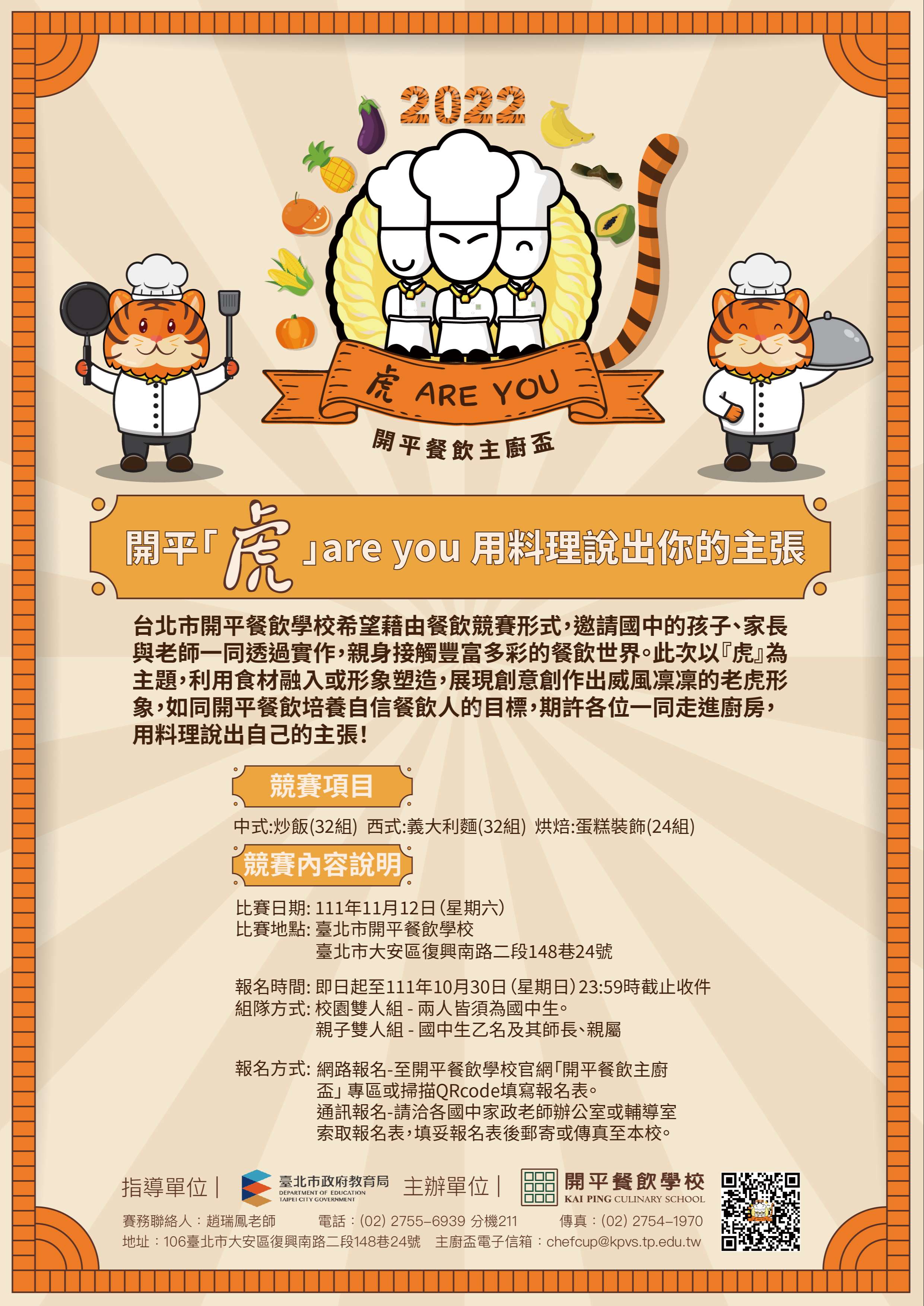 二、本屆比賽類別:分「中式炒飯」、「義大利麵」及「蛋糕裝飾」三項。藉由「開平『虎』are you」為主題,老虎具威風凜凜的大眾印象,如同開平餐飲培養自信餐飲人的目標,邀請喜愛餐飲的國中生,能內觀自身興趣發展,並依主題盡情發揮創意,以料理展現自我、創造未來無限可能。