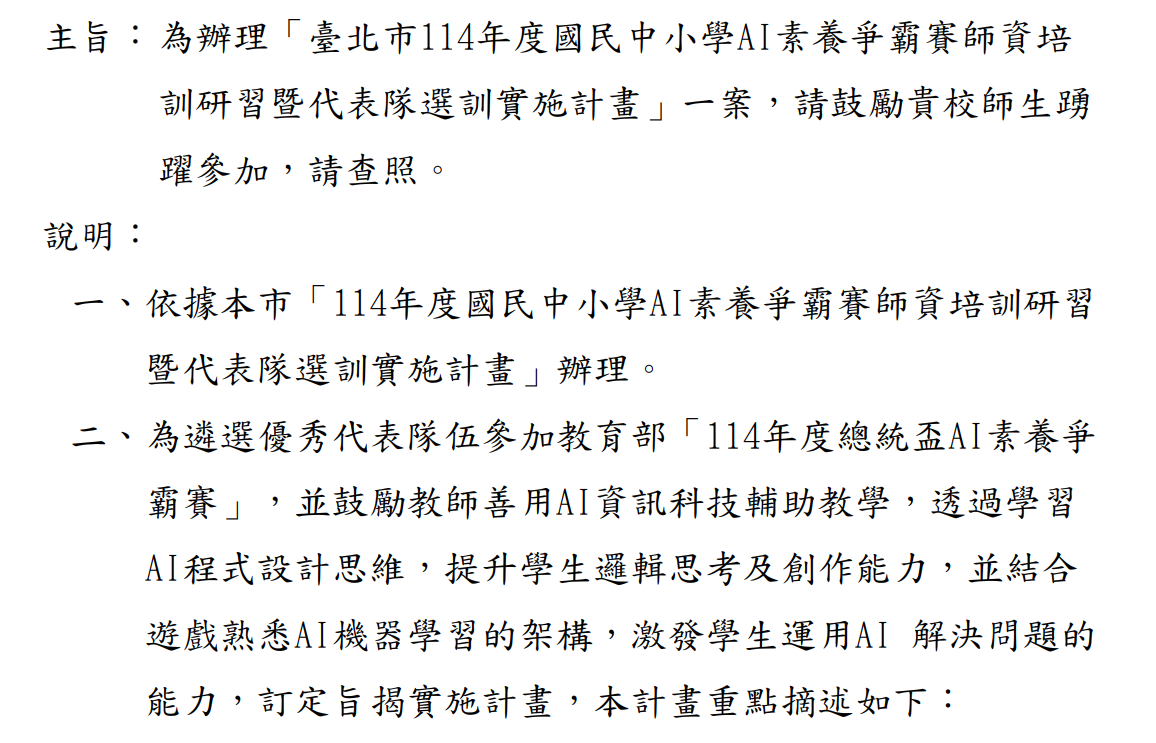 「臺北市114年度國民中小學AI素養爭霸賽師資培訓研習暨代表隊選訓實施計畫」一案,鼓勵師生踴躍參加