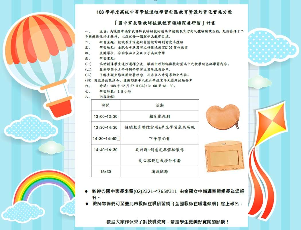 二、研習流程如下:(詳細內容請見附件)13:00-13:30 報到13: 30-14:30 技職教育整體說明及學生學習成果展現14:30- 14:40 下午茶14:40-16:30 設計群課程體驗:創意皮革製作-零錢包或證件卡套16:30-滿載賦歸
