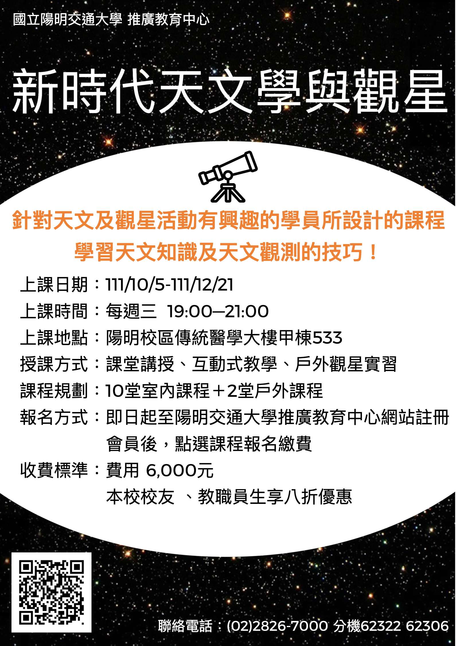 一、課程協助學員建立最基本的宇宙觀,瞭解最新的天文宇宙 學知識,學習各種天文觀測的技巧,提昇個人對天文學的 興趣與關心;建立正確的與基本的宇宙觀,課程內容包含 至陽明山做觀星教學。