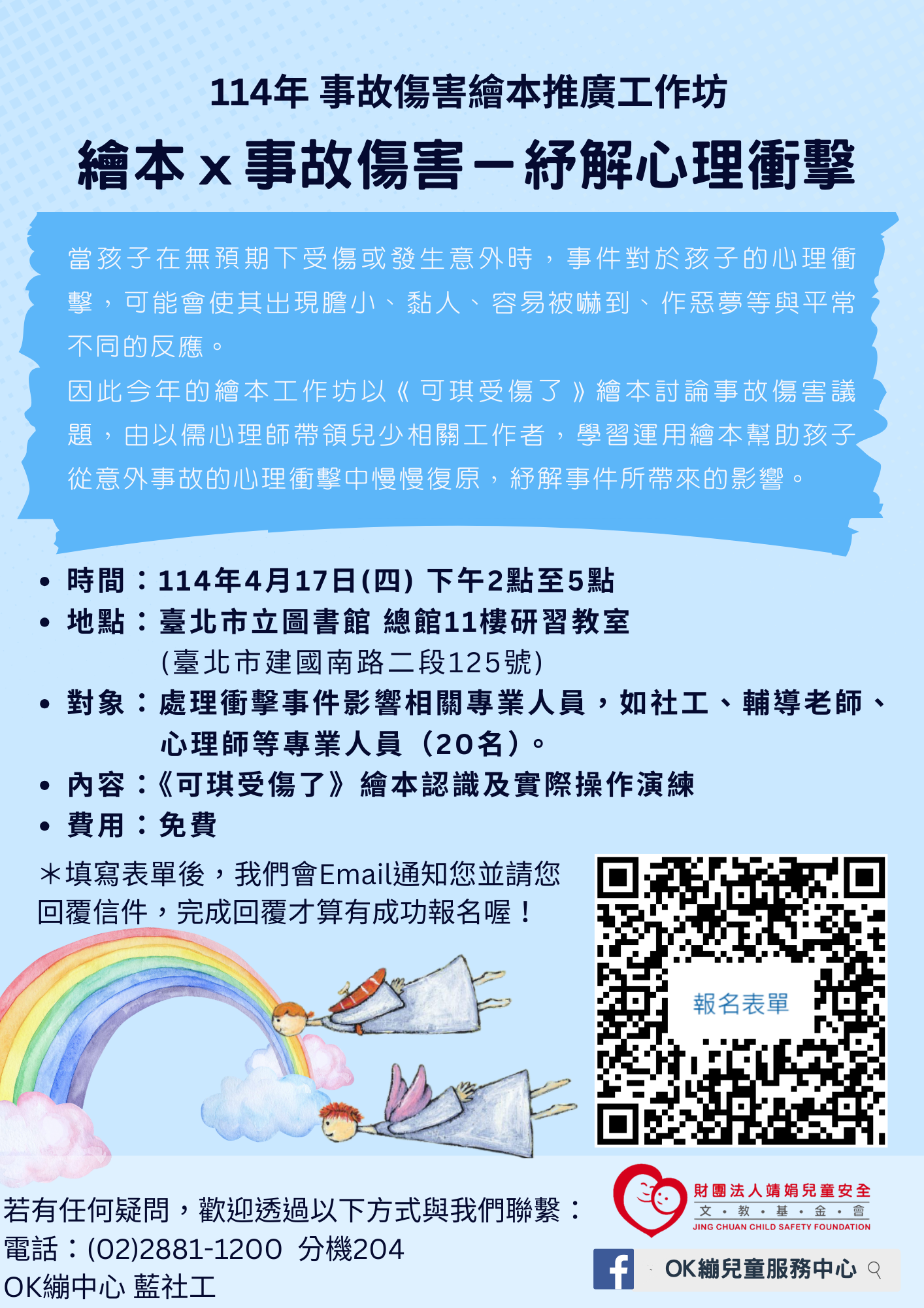 五、檢附「114年事故傷害繪本推廣工作坊《繪本x事故傷害— 紓解心理衝擊》」宣傳單1份。