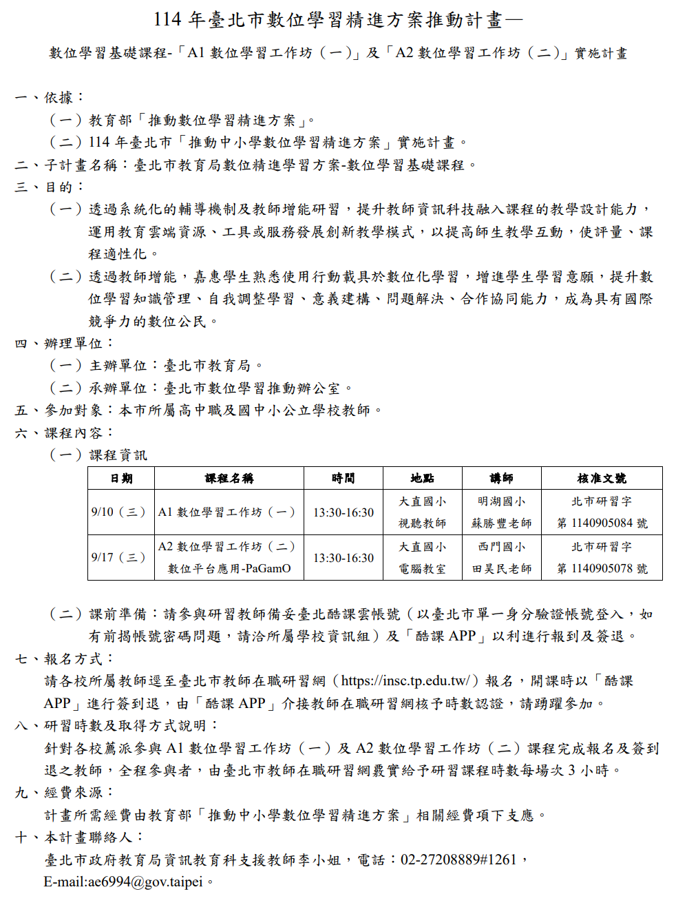 114 年臺北市數位學習精進方案推動計畫— 數位學習基礎課程-「A1 數位學習工作坊(一)」及「A2 數位學習工作坊(二)」實施計畫