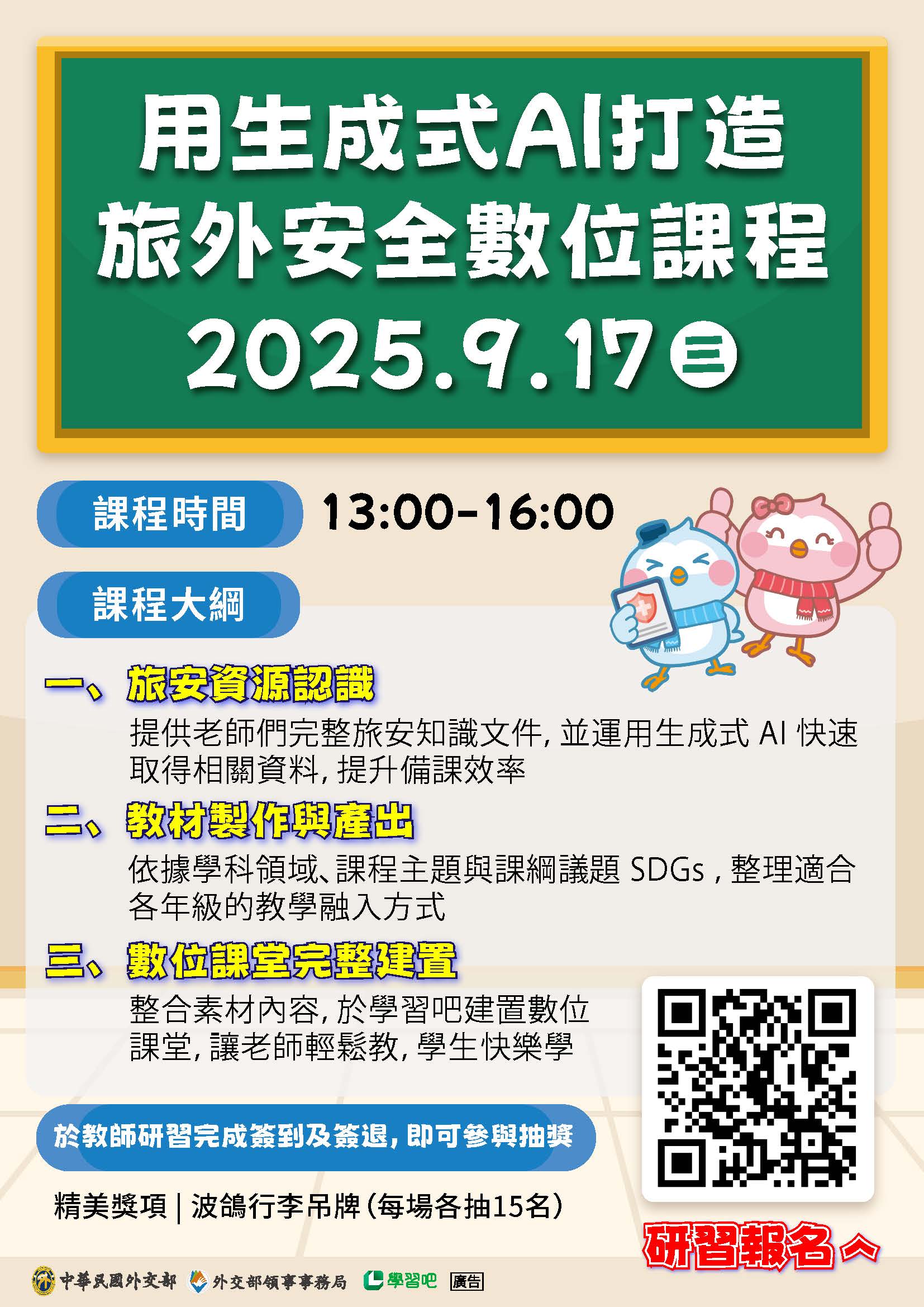 (一)活動目標:協助參與線上研習教師,運用AI工具活用旅 外安全教學素材,打造互動式數位旅外安全課程。