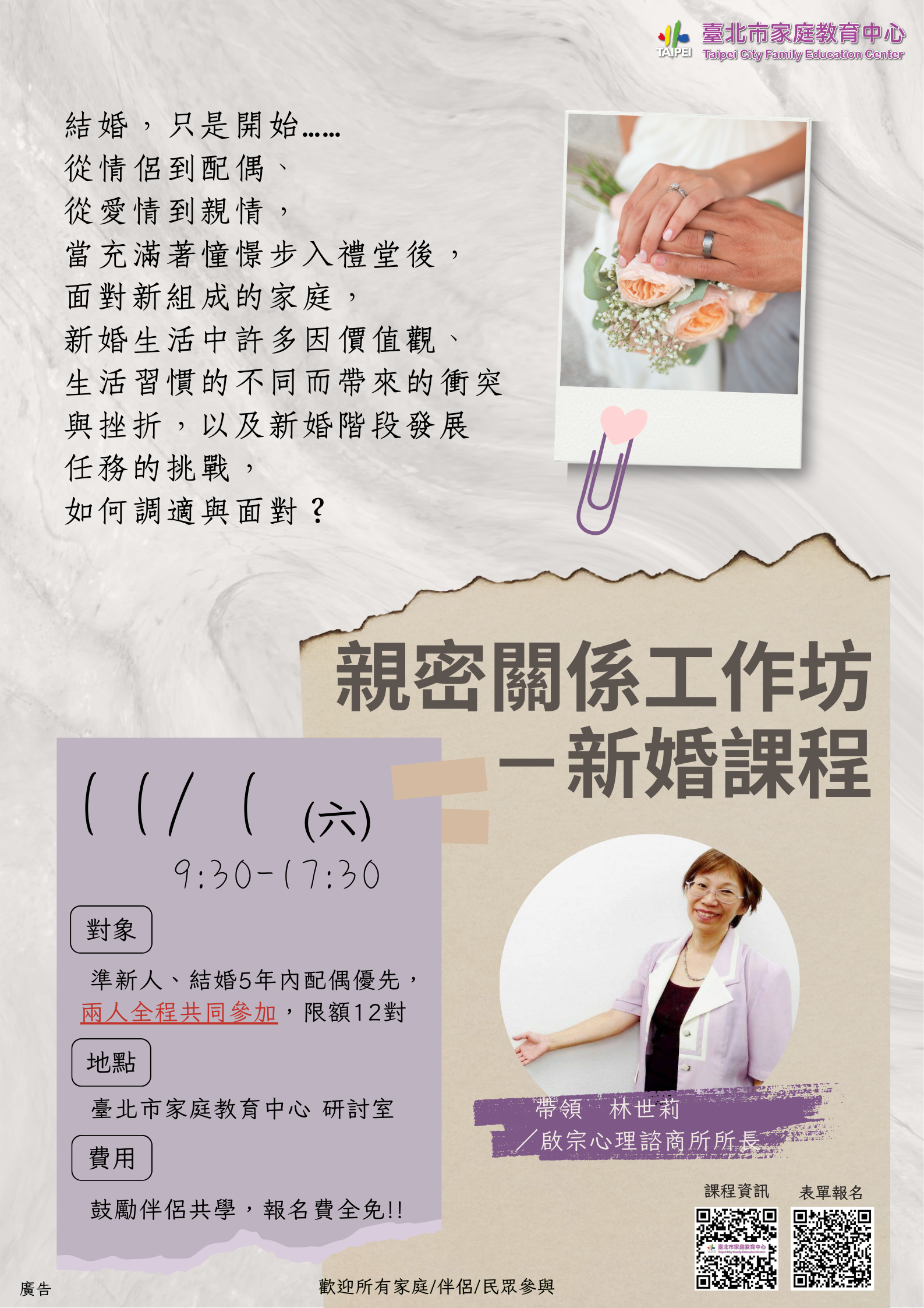 五、報名:即日起至114年10月28日止,額滿採候補報名登記制,相關內容可於本中心網站(https://family.gov.taipei/Default.aspx)課程與活動瀏覽、下載。