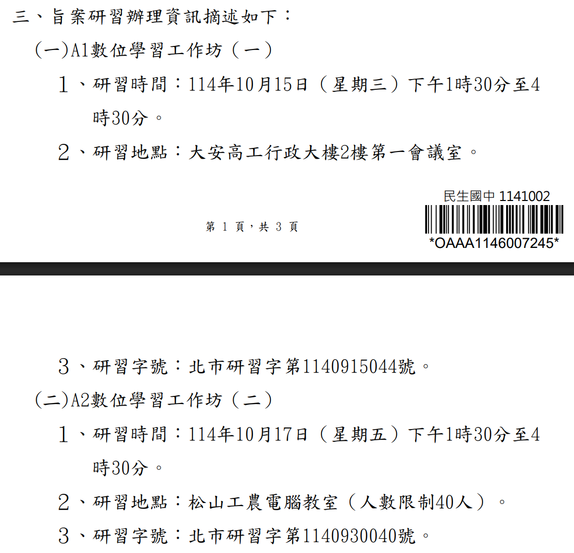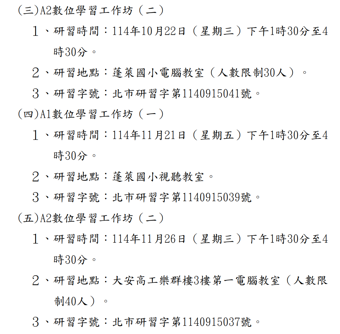 臺北市政府教育局辦理114年度本市數位學習研習「A1數位學習工作坊(一)」及「A2數位學習工作坊(二)」,鼓勵所屬教師報名參與,並依權責核予出席人員公(差)假派代.