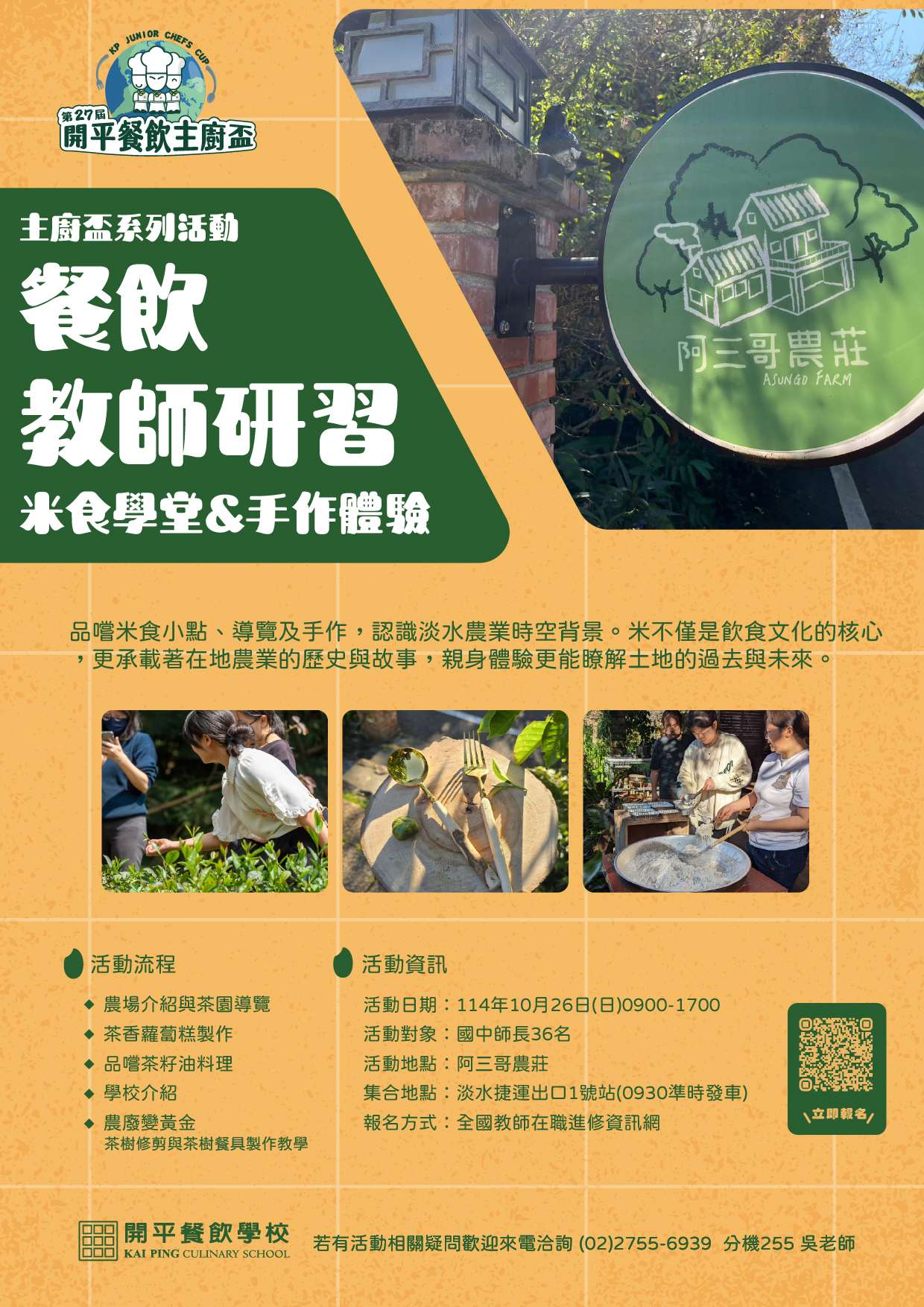 四、報名方式:採線上報名,請上“全國教師在職進修資訊網” 報名,課程名稱:餐飲教師研習_米食學堂&手作體驗。報名截止日期:114年10月23日(三),課程名單將於開課前三 天確認遴選名單。