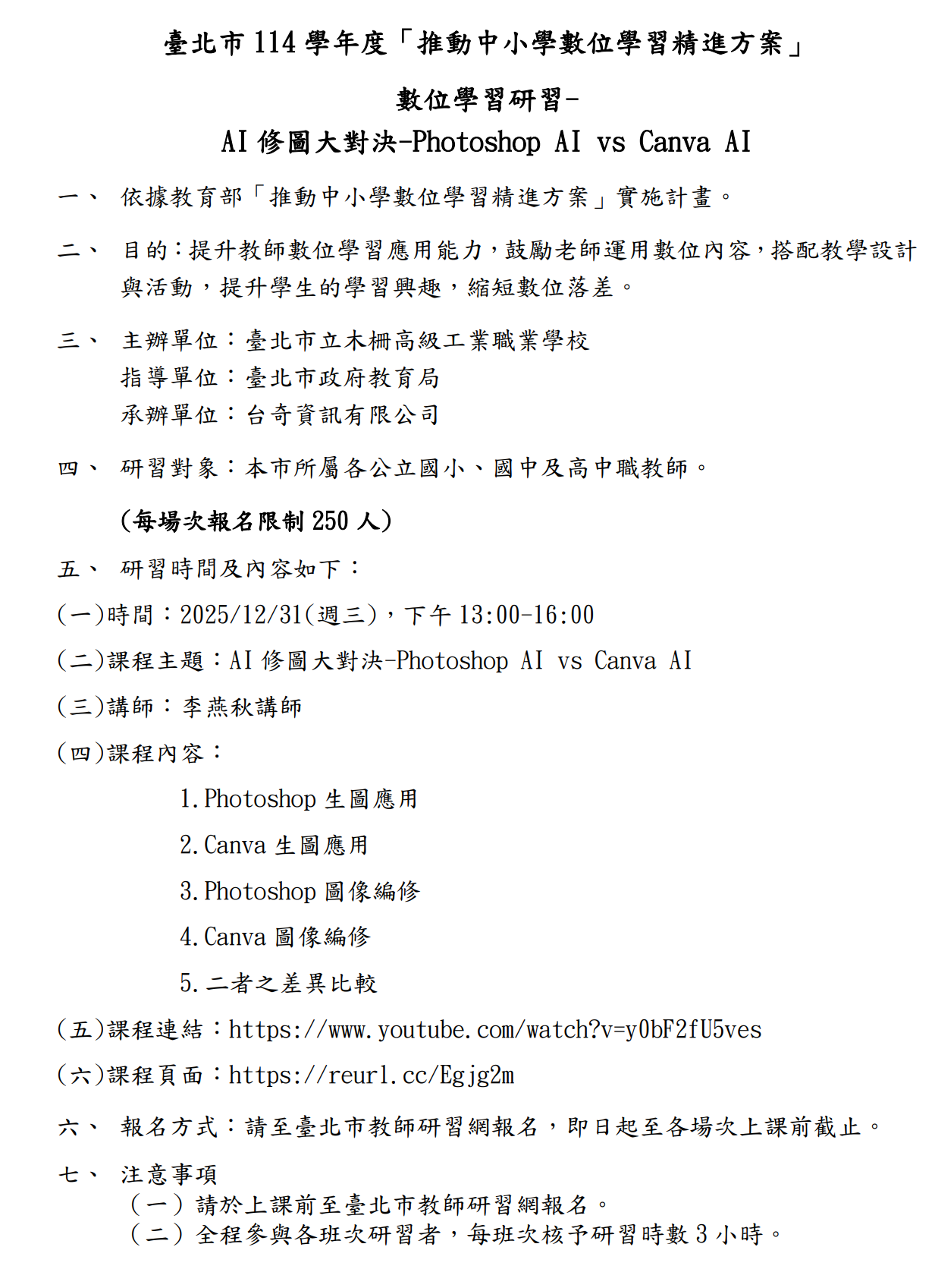 臺北市「推動中小學數位學習精進方案」 數位學習研習(AI修圖大對決-Photoshop AI vs Canva AI),鼓勵師踴躍參加
