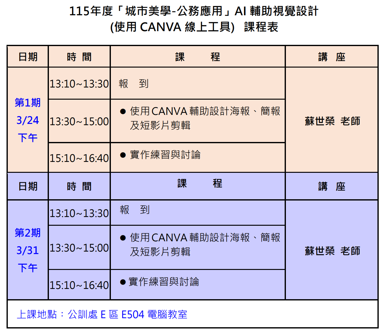 臺北市政府公務人員訓練處115年度「城市美學-公務應用」AI輔助視覺設計(使用CANVA線上工具)班期課程表