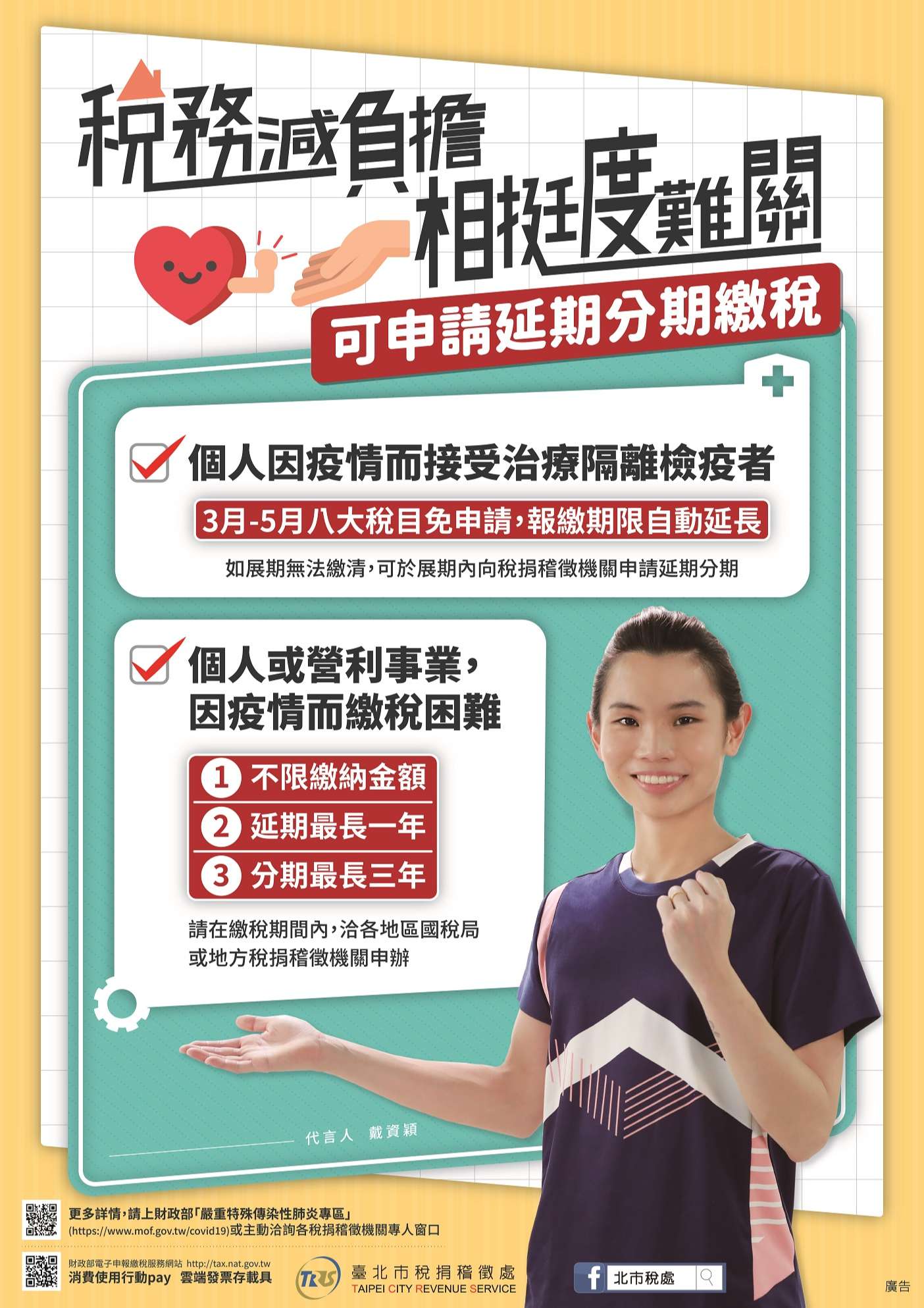「109年房屋稅開徵 囉!繳納期間自109年5月1日起至109年5月31日止,e化多 元繳納管道真便利,敬請如期繳納,以免逾期受罰。納稅 義務人受嚴重特殊傳染疫情影響,不能於規定期間內完納 稅捐者,得於規定納稅期間內向該管機關申請延期或分期 繳納,臺北市稅捐稽徵處松山分處關心您」。
