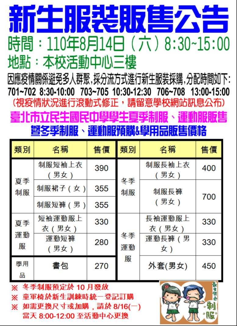 制服訂購日期:110年8月14日(六) 8:30~15:00
