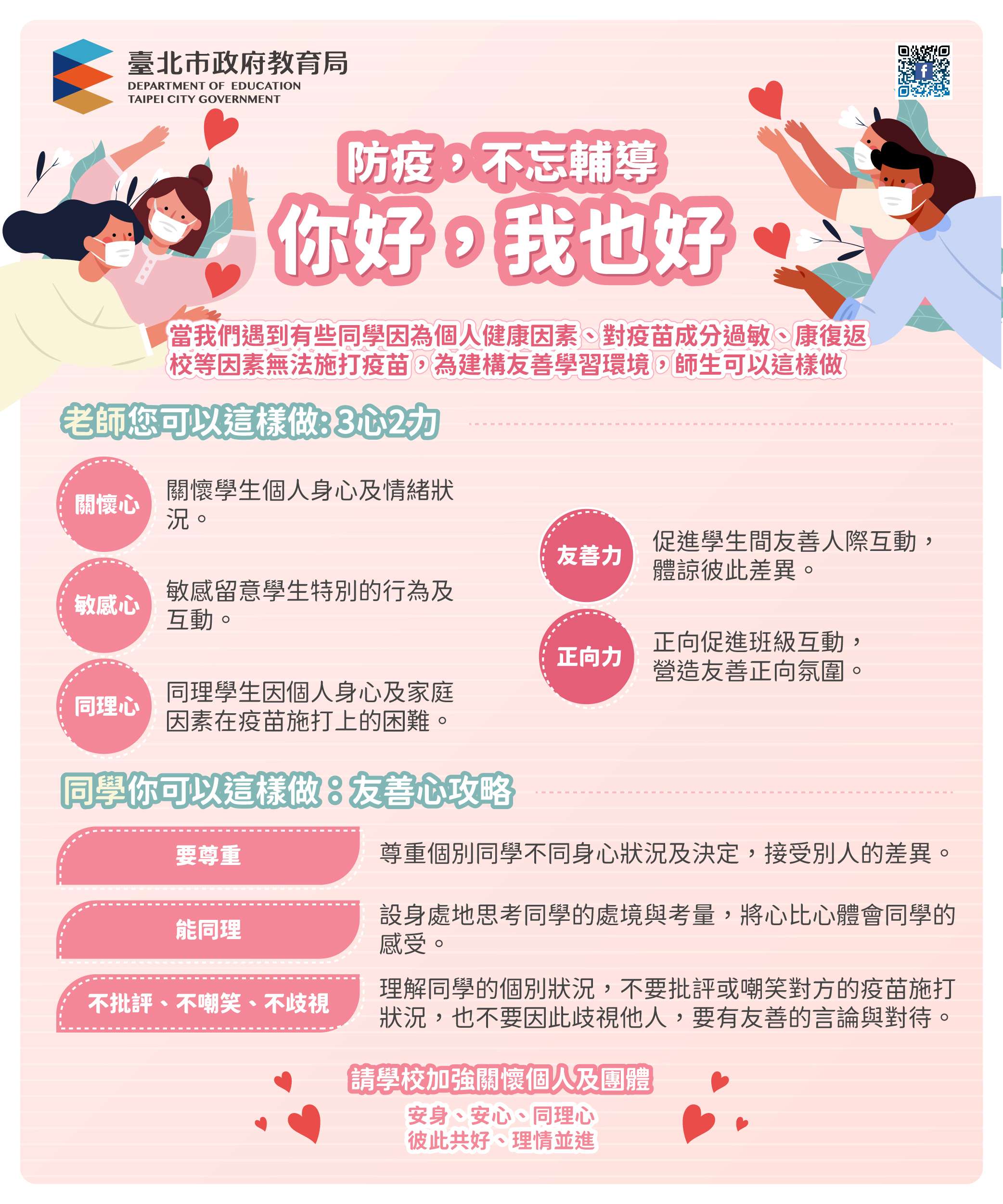 四、為落實學生互相尊重他人之觀念,該局提供各校旨揭文宣,分為老師及學生之關懷作法,請學校積極運用,並加強向校內師生宣導尊重個人疫苗施打意願,落實學生學習及尊重彼此差異性的存在,建構校內友善氛圍。