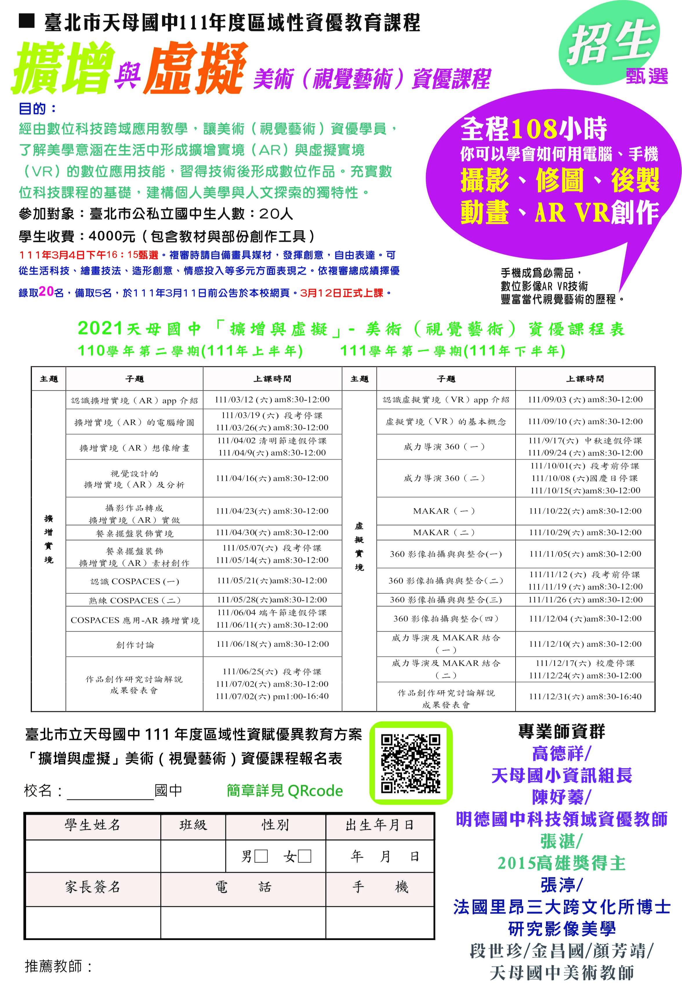 四、報名方式:請於111年3月3日前向各校輔導室特教組報名; 或請於111年3月4日前統整後,掃描文件以電子郵件方式 (gifted@tmjh.tp.edu.tw)傳送天母國中特教組。