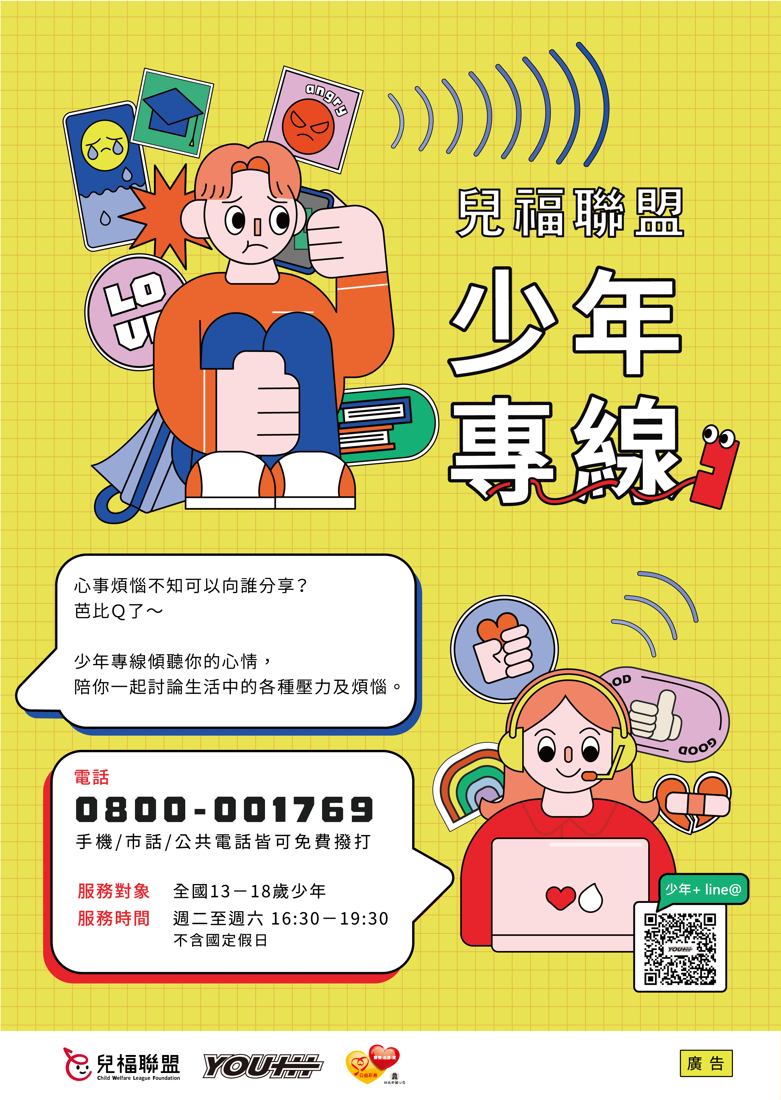 說明: 本會辦理「兒福聯盟-少年專線服務(0800-001769)」, 提供全台12歲至18歲之少年免付費電話諮詢服務,服務時間為每週二至週六下午4:30至7:30。期待透過此專線傾聽少年的需求,協助其抒發壓力,並引導、陪伴他們面對和解決困難。