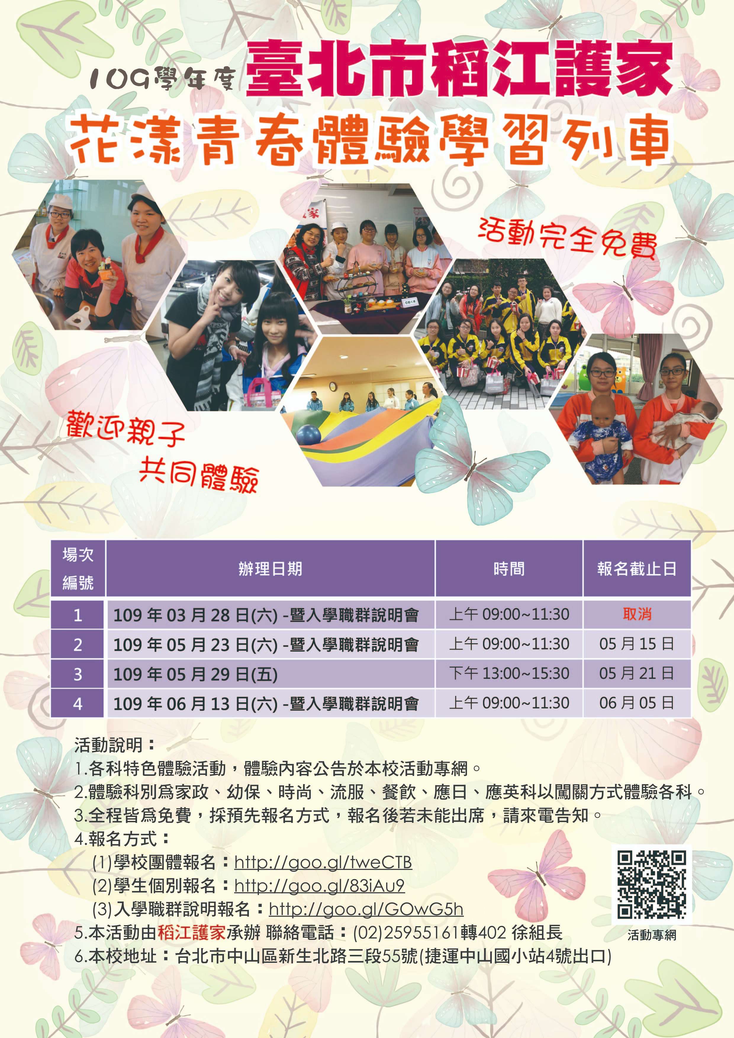 二、為協助學生及家長多元探索與體驗,學校於109年5月23日 (六)、109年5月29日(五)及109年6月13日(六)辦理 「群科體驗活動─花漾青春體驗學習列車」及「新生家長說明會」,認識與感受學校技職教育創新能量,以啟發學生多元智能及性向,協助學生尋覓自我最適進路。