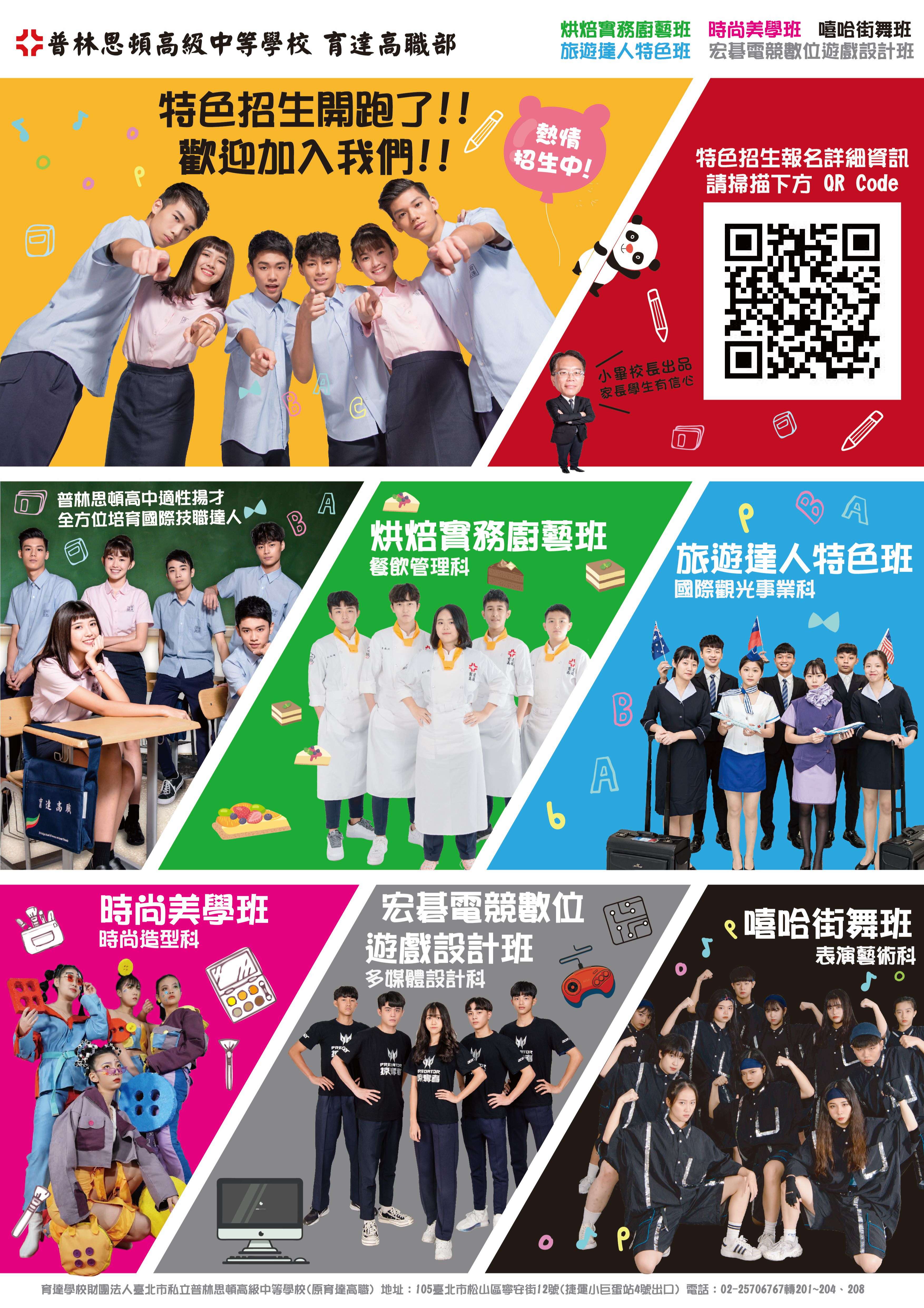一、本校110學年度特色招生專業群科甄選項科別: (一)餐飲管理科-烘焙實務廚藝班 (二)觀光事業科-旅遊達人特色班 (三)多媒體設計科-宏碁電競數位遊戲設計班 (四)表演藝術科-街舞班 (五)時尚造型科-時尚美學班