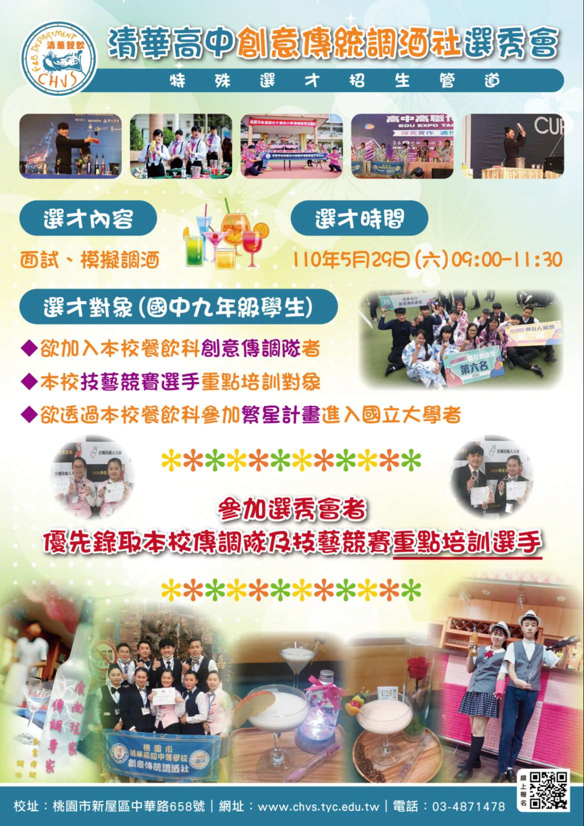 四、對象: 有意加入清華高中創意傳統調酒隊者、有意加入技藝競賽重點培訓選手者、有意透過繁星計畫進入國立科大者及有意加入餐飲科之同學。