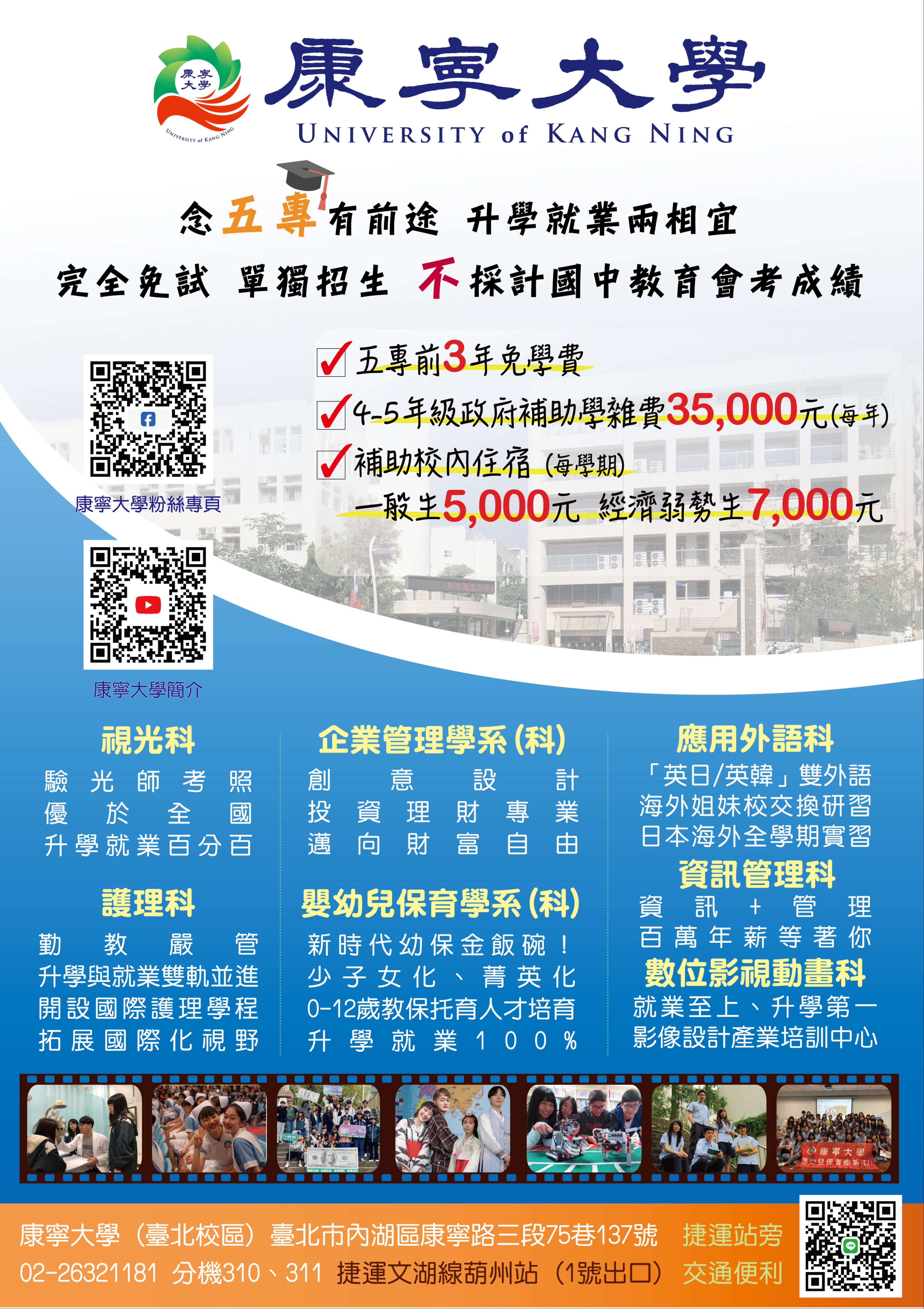 四、聯絡人資訊:康寧學校財團法人康寧大學招生中心高惠玲主任 聯絡電話:(02)2632-1181分機310;0916-051-882 E-mail:shirly02@g.ukn.edu.tw Line ID:shirlykao945945