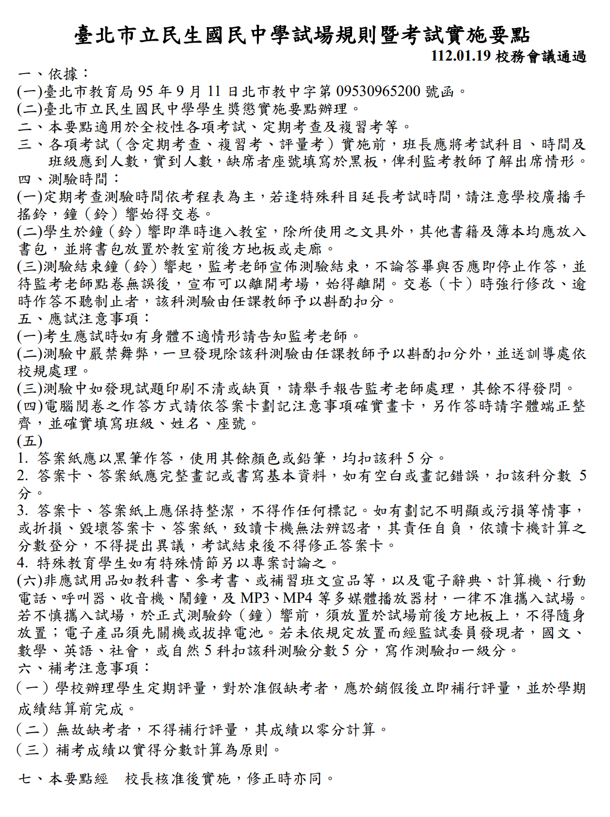 民生國中試場規則暨考試實施要點-1120119校務會議通過